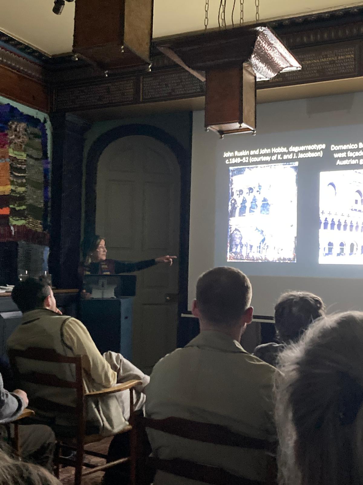 The Society would like to thank Dr Emma Sdegno, who flew all the way from Venice to address the Society on the subject of Ruskin’s cinematic eye, contrasting his way of situating readers in a scene and descriptively choreographying a sequence of ‘shots’ with the less satisfying viewing system of the train window. This fascinating discussion of Ruskin’s way of prefiguring cinematic method proved a rich sequel to an earlier Society event focused on Ruskin as he has been represented in film. The event was also distinguished for playing host to the first UK premier of Allessandra Lancelotti’s The city is lost. Ruskin’s Venice Today.